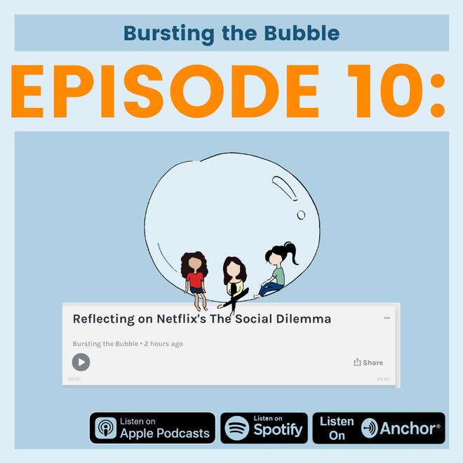In this episode we talk about The Social Dilemma, a Netflix documentary that reveals the alarming impact of social media. Together, we recap the most memorable parts of the show, reflect on our own social media usage, and explore the larger effects of media on younger generations.